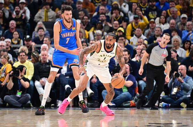 第四節(jié)比賽,步行者前2分半鐘追到85-85,霍姆格倫暴扣,馬瑟林兩罰全中,亞歷山大與西亞卡姆對(duì)攻一記三分。雙方繼續(xù)接連得分,西亞卡姆三分與馬瑟林兩罰全中反超3分,雷霆一波7-2攻勢(shì)反超2分。步行者連得5分奪回領(lǐng)先打停雷霆,雷霆沖擊內(nèi)線追到差1分,馬瑟林連得4分維持3分優(yōu)勢(shì)。米切爾與亞歷山大接連上籃反超1分,沃克拉桿反籃命中,霍姆格倫兩罰全中領(lǐng)先1分。雙方接連三分不中,亞歷山大被犯規(guī)兩罰一中維持2分優(yōu)勢(shì),西亞卡姆關(guān)鍵中投追平,亞歷山大三分不中無(wú)緣絕殺,常規(guī)時(shí)間雙方113-113。